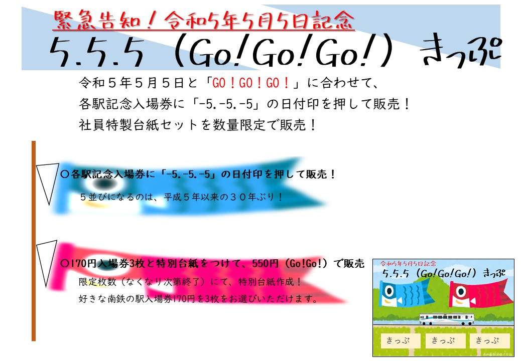 」に合わせて、明日5月5日は。各駅記念入場券に「-5.-5.-5」の日付印を押して販売します!また、社員特製台紙セットを数量限定で発売!各駅記念入場券170円を3枚と特製台紙を合わせて、550円(GO!GO!)で販売します!