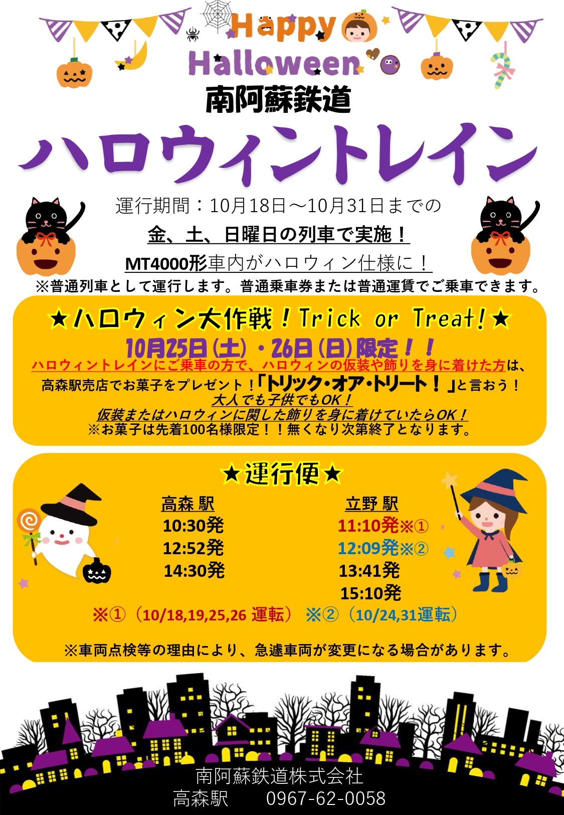 10/25・26は、お菓子のプレゼントもあるよ!!大人も子供も楽しめるイベントです!ぜひ南阿蘇鉄道へ遊びにおいで!