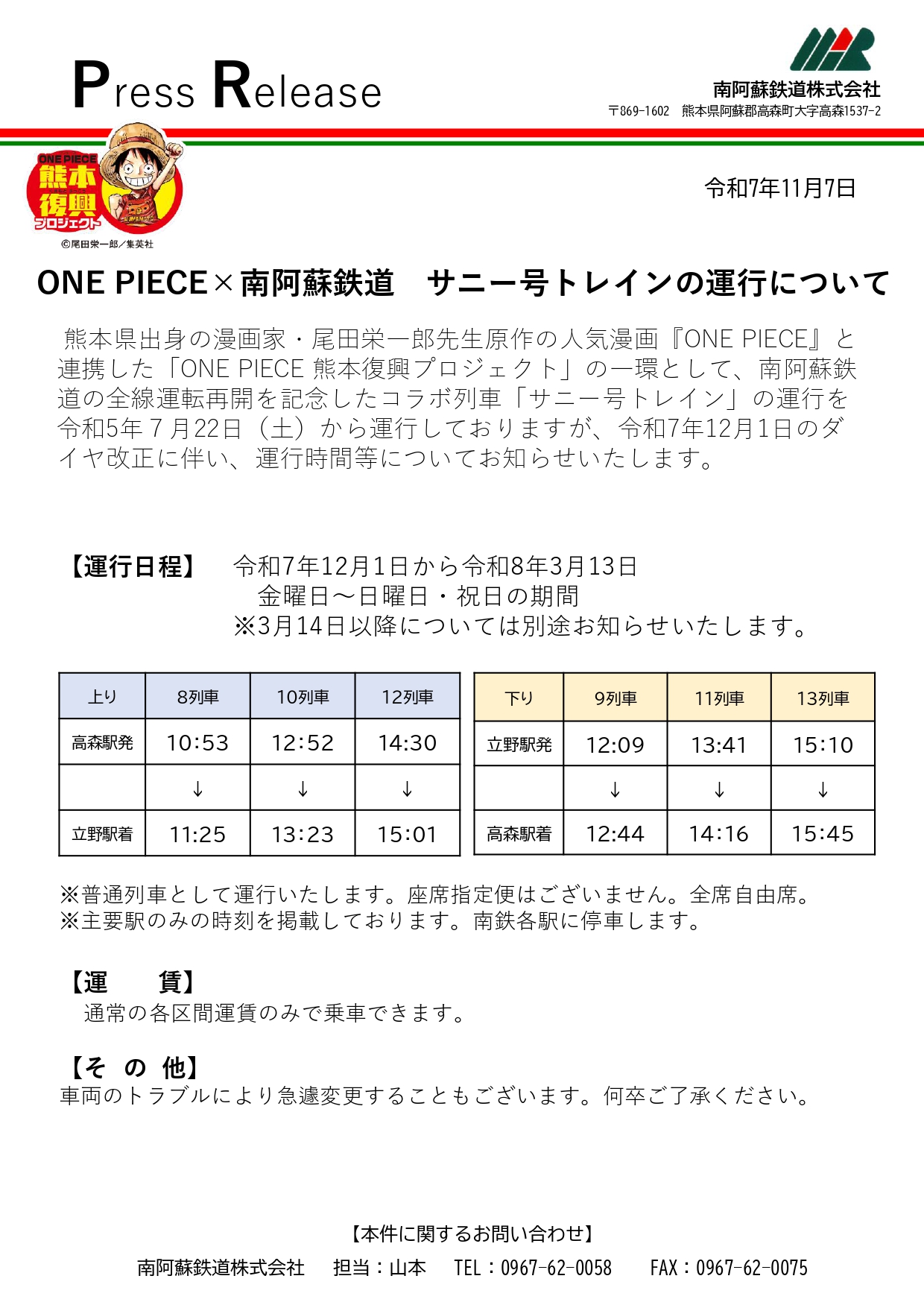 ONE PIECE×南阿蘇鉄道 サニー号トレイン12月からの運行について