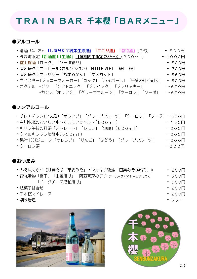 日向往還高森峠には“千本櫻”と称する桜並木があり、毎年春には南阿蘇に住む者の目を楽しませております。そんな春の訪れを待つ南郷谷の冬景色を眺めながら、熊本最古の酒蔵で醸す清酒「れいざん」の新酒をはじめとした、様々なお酒を楽しむことが出来る…そんなしっとりとした“大人旅”のご提案です。