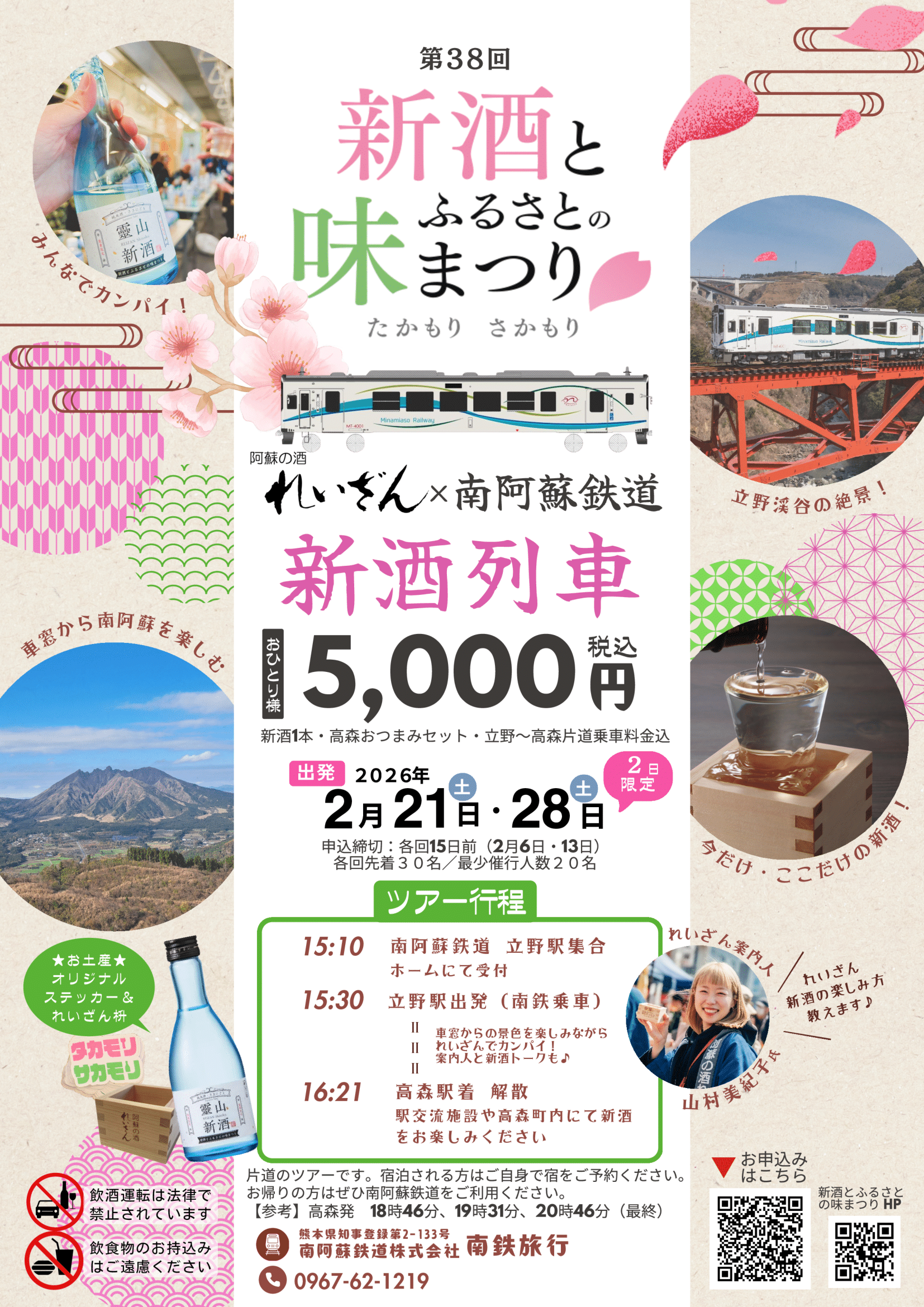 この時期に高森でしか味わえない、阿蘇の酒「れいざん」の特別な新酒を、南阿蘇の風景とともにお楽しみいただける新酒列車を企画しました。